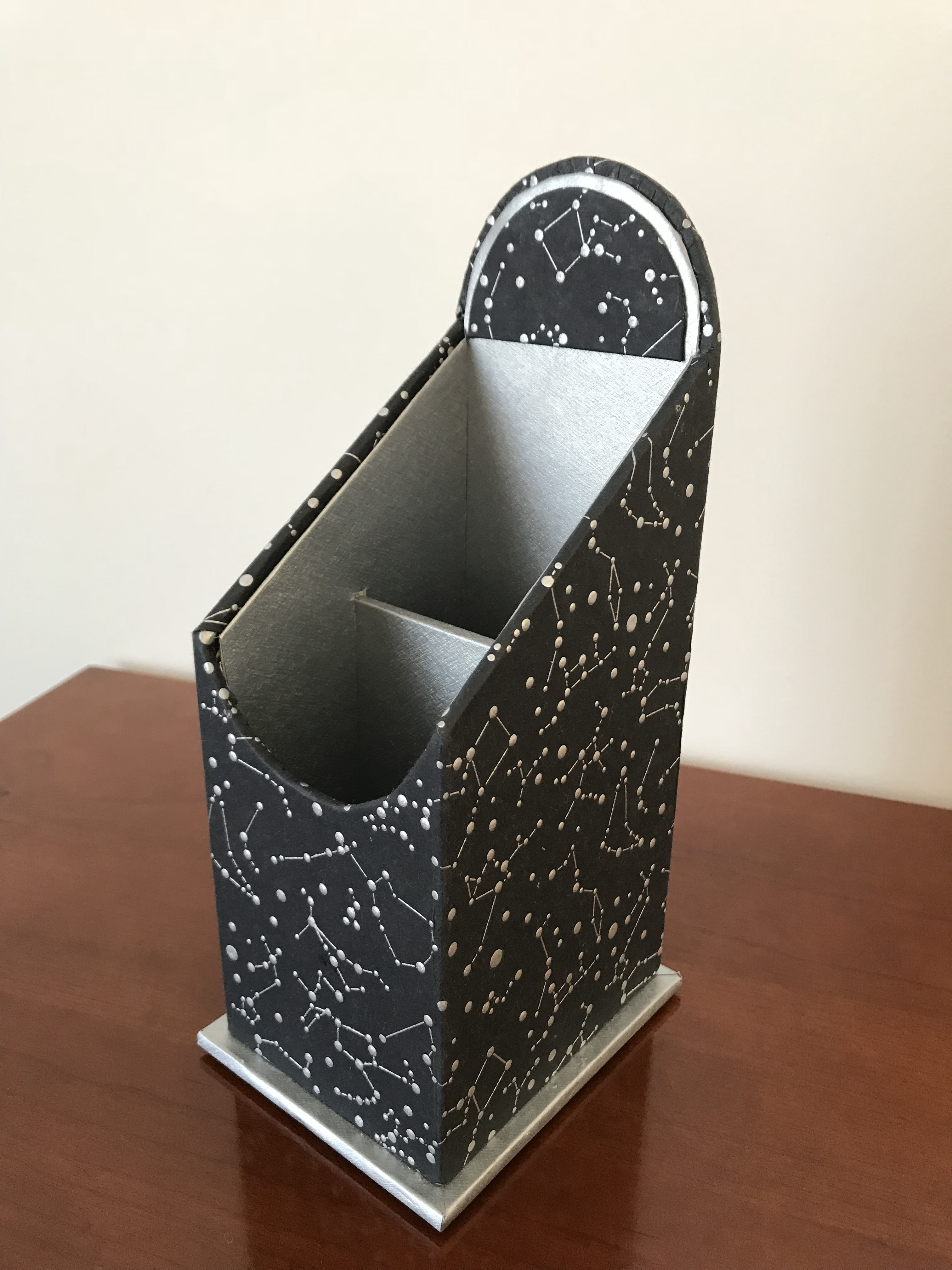Descriptions techniques Dimensions : Socle 11 x 9 cm Hauteur totale 23 cm Papier décoratif extérieur : Papier décoratif Astral Papier décoratif intérieur : Papier décoratif argent martelé Type de carton : Carton de fond et cartonnette de propreté Accessoires : Tampons anti-glissants silicone