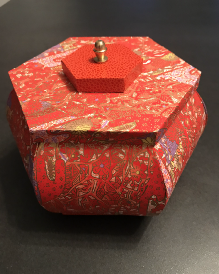 Descriptions techniques Dimensions en cm : 20,5 x 10,5 x 10,5 Papier décoratif extérieur : Papier Velour Rouge et Papier décoratif japonais – Ibis – Papier décoratif intérieur : Papier Velour Beige Type de carton : Carton de fond (C.F.) et cartonnette (CT) Accessoires : Bouton doré Sur une idée de mes professeurs : Christine …