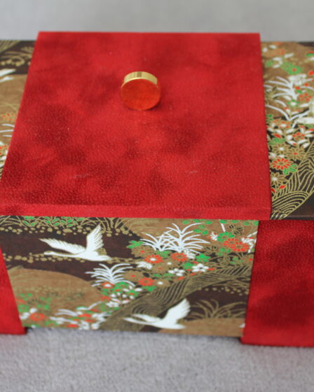 Descriptions techniques Dimensions : Papier décoratif extérieur : Papier décoratif japonais Ibis Papier décoratif intérieur : Simili velours beige Type de carton : carton biseau et cartonnette de propreté Accessoires : Tampons anti-glissants silicone