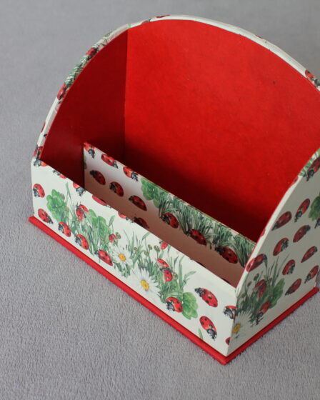 Descriptions Techniques Dimensions en cm : 25 L X 12 l X 21 H Papier décoratif extérieur : Papier fantaisie Italien « Coccinelles » Papier décoratif intérieur : Papier uni canson Type de carton : Carton biseau (C.B.) et cartonnette (CT.) Accessoires : Pieds métal doré avec attaches parisiennes. Pour l’assemblage : Coller les cotés CONTRE la …