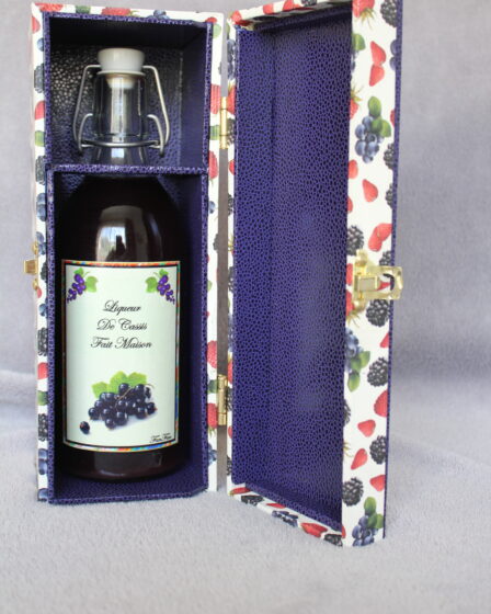 Description Technique Photos ci-dessous Dimensions en cm : Hauteur 25,3 cm X Profondeur 12 cm, largeur 11,5 cm Papier décoratif extérieur : Papier décoratif italien à motifs de framboises, myrtilles, cassis. Papier décoratif intérieur : Skyvertex bleu foncé. Type de carton : Carton biseau (C.B.) carton de fond (C. F.) et cartonnette. Accessoires : Charnières …